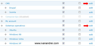 6) Seleccionamos la opción "Navigation" y podras ver todos las categorias. Pero no queremis que se muestre ahi, si no en el menú categorias. Entonces seleccionamos la opción "Edit" de la categoria (no de la subcategoria).