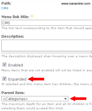 7) En "Parent item" seleccionamos como menu "Categorias" que hemos creado. Si deseamos mostrar las subcategorias en nuestro nuevo menu entonces seleccionamos la opción "Expanded" y lo guardamos. Repetimos el mismo proceso para cada categoria.